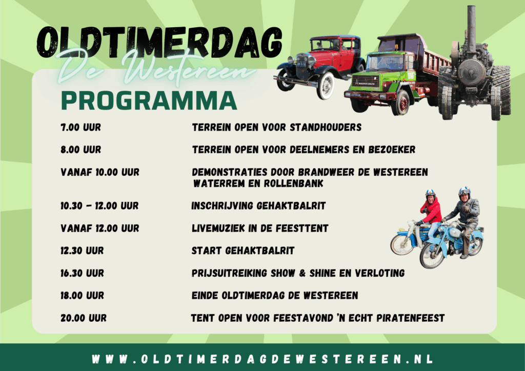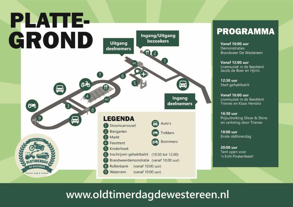 Programma & Info Een dagje uit voor jong en oud!Gedurende de hele dag is er voor jong en oud van alles te beleven op de Oldtimerdag. Voor de deelnemers en bezoekers staan er namelijk allemaal leuke dingen op de planning. Bekijk hieronder het programma, de plattegrond en de parkeerinformatie!